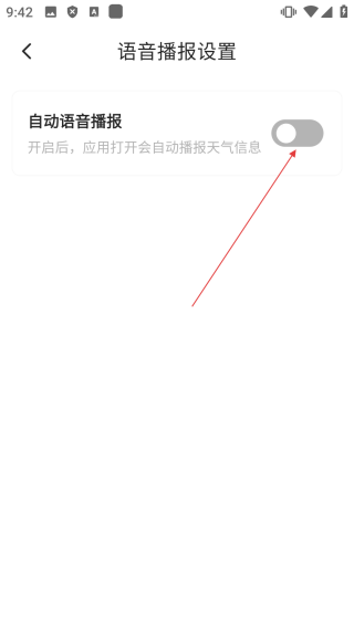 4、在语音播报设置界面,开启【自动语音播报】,即可打开时将自动播报天气信息。