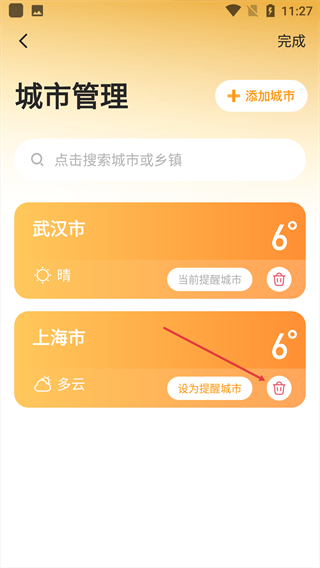 3、进入编辑状态后,点击城市卡片的删除按钮。