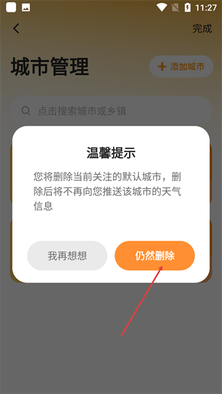 4、弹出温馨提示,确认移除则点击【仍然删除】,该城市会被移除。