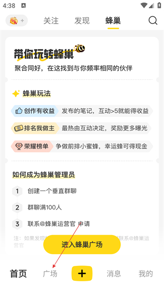 1、在首页中,点击【广场】按钮,进入广场页面。