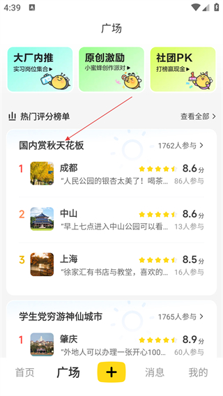 2、在广场页面,找到【国内赏秋天花板】榜单,点击进入榜单详情页。