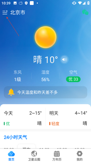1、在天气界面,点击【左上角菜单按钮】,进入城市管理界面。