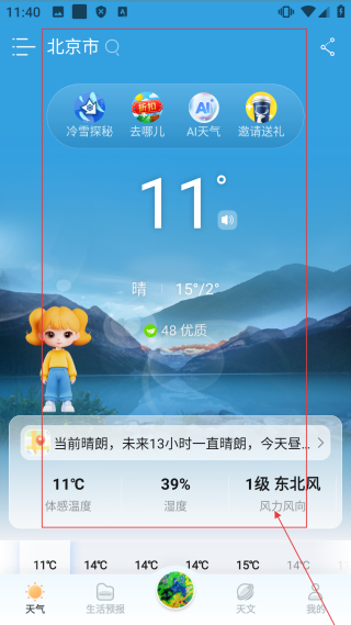 1、进入天气界面,可【查看北京市实时天气,包括温度、天气状况、体感温度】等,享受天气查询与特色服务。