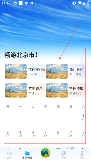 2、进入生活预报界面,可【查看畅游北京市的相关服务,如精选赏花、热门景区】等,获取生活游玩资讯。