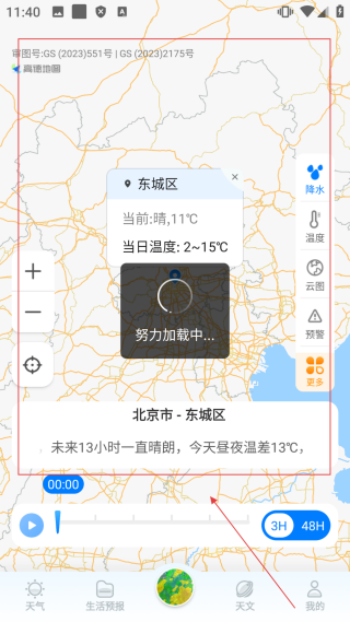 3、进入地图界面,可【查看北京市东城区的天气地图,了解降水、温度】等分布,掌握区域天气动态。