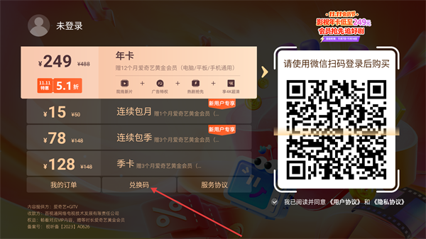 3、在会员购买页面,可点击【兑换码】使用兑换码兑换会员权益。