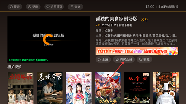 2、观看【孤独的美食家剧场版】时,若需观看可点击【购买会员】按钮开通会员后观看。