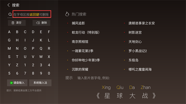 2、在搜索页面,在字母区按返回键可删除输入内容。