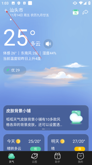 1、在天气界面,点击左上角【+】,进入城市管理界面。