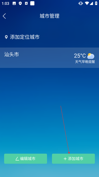2、在城市管理界面,点击【+添加城市】,进入城市添加界面。