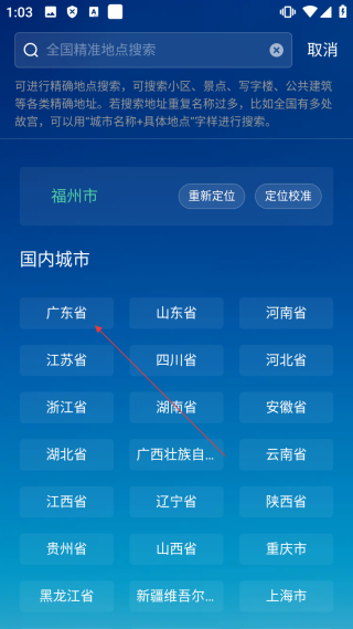 3、在城市添加界面【选择国内省份】,进入该省份城市选择界面。