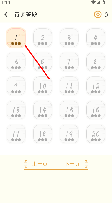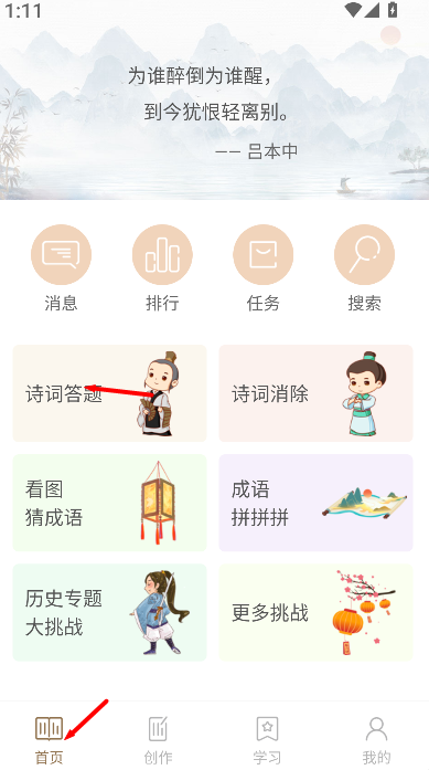 1、打开app后进入主页,点击诗词答题入口即可开始挑战诗词闯关内容。