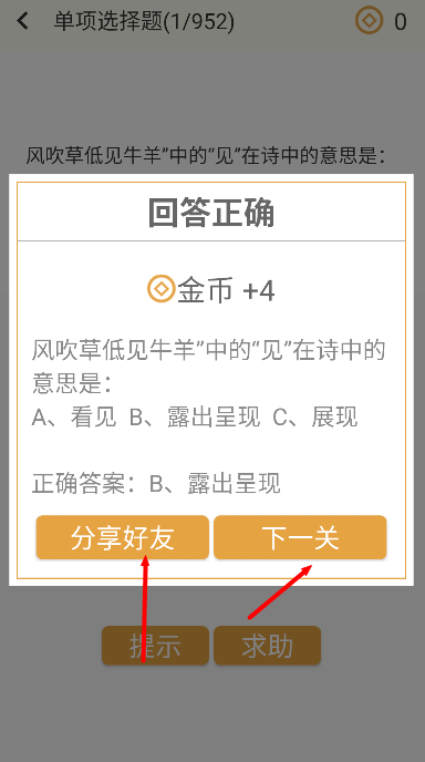 4、答题成功后可选择分享成果给好友,也可直接点击进入下一关继续挑战。