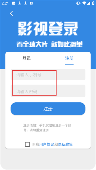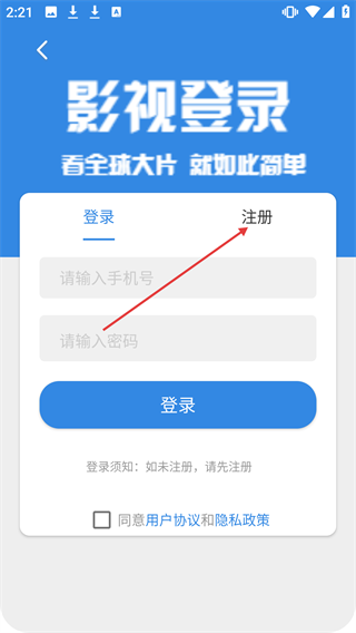 3、在【影视登录】页面,若未注册可点击【注册】选项进行账号注册。