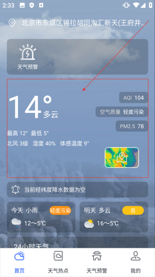 1、进入首页界面,可【查看北京市东城区实时天气,包括温度、天气状况】等,享受天气查询服务。