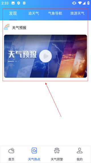 2、进入天气热点界面,可【查看天气预报视频,了解天气热点资讯】,获取天气相关内容。