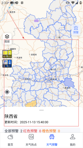 3、进入天气预警界面,可【查看陕西省天气预警地图,了解预警类型与数量】,掌握天气预警动态。