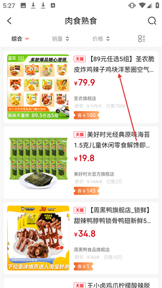 2、在【肉食熟食】商品列表中,点击【圣农脆皮炸鸡辣子鸡块洋葱圈空气...】商品进入详情页。