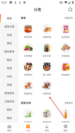 1、在分类页面找到【美食】分类,点击【肉食熟食】进入对应商品列表。