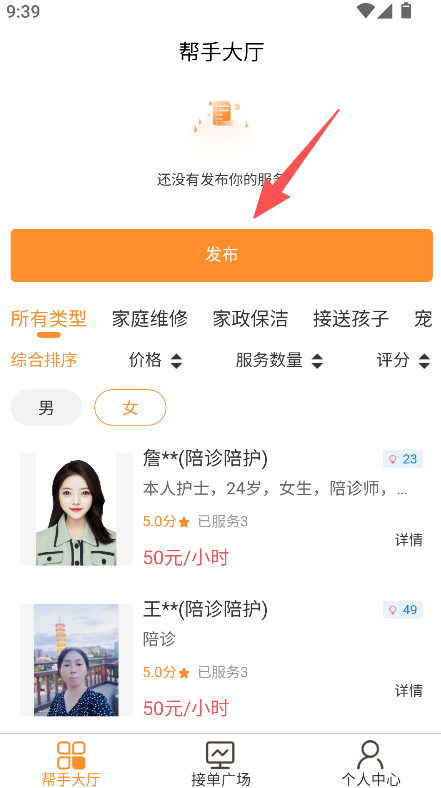 1、服务发布便捷,在帮手大厅一键发布,快速展示服务技能,提升接单机会。