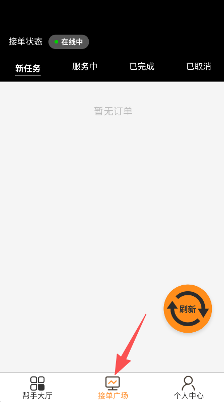 2、进入接单广场,查看新任务、服务中订单,管理接单状态。