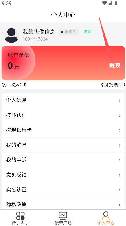 3、进入个人中心,可进行提现操作,管理账户及个人信息。