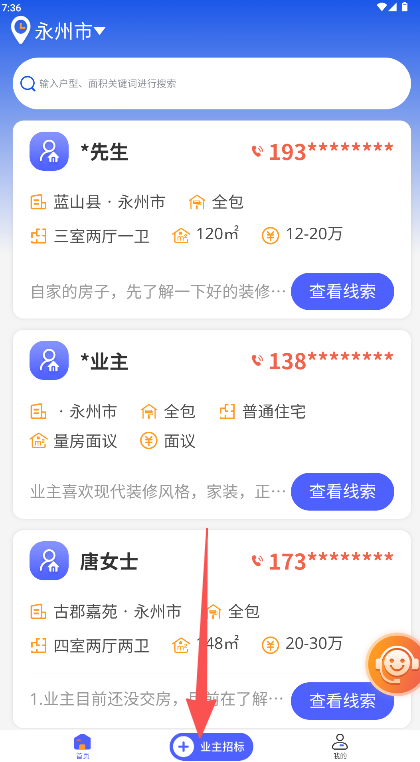 2、具备线索查看机制,服务方可点击查看按钮获取更详细的业主联系信息与需求说明。