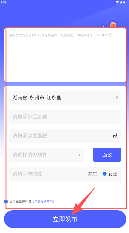 3、填写信息并勾选声明后点击“立即发布”按钮。