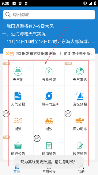 1、进入首页界面,可使用【天气图、气象预警、天气雷达】等功能,享受海洋天气查询服务。