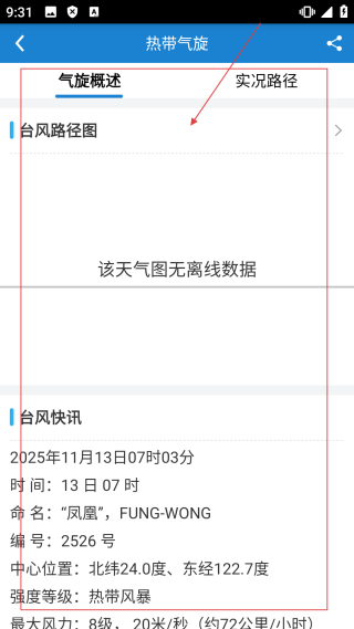 4、进入热带气旋界面,可【查看气旋概述、实况路径,了解台风路径图、台风快讯】,获取热带气旋相关信息。