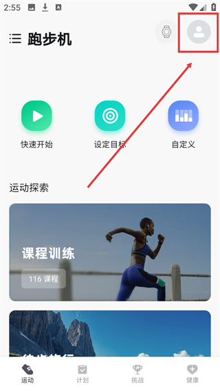 1、在跑步机页面,点击右上角个人头像图标,进入【我的】页面。