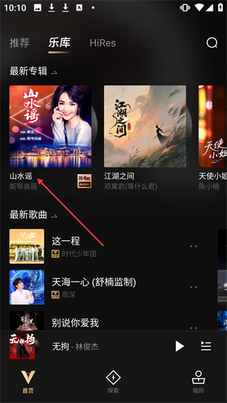 2、在乐库页面“最新专辑”区域,点击【山水谣】专辑封面,进入专辑详情页。