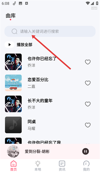 1、打开畅听免费音乐,进入曲库页面后,点击顶部的搜索框,即可准备输入内容啦。