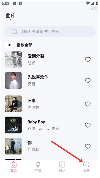 1、在音乐应用【曲库】页面,点击底部【资讯】按钮可进入资讯页面。