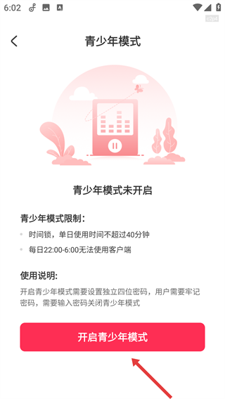 3、之后我们可以了解其限制规则,再点击【开启青少年模式】按钮,准备设置独立密码来启用该功能呀。