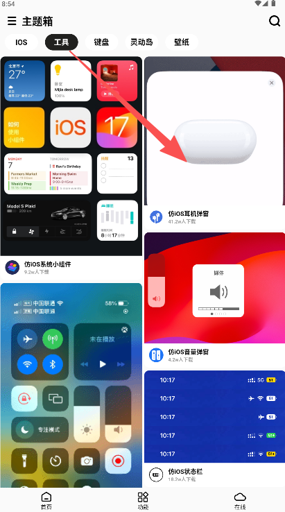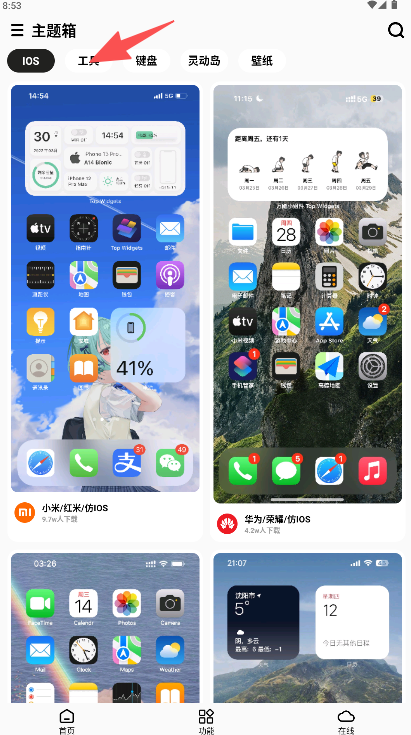 1、支持按照不同的分类标签浏览主题,例如选择IOS风格或特定类型的桌面工具组件。