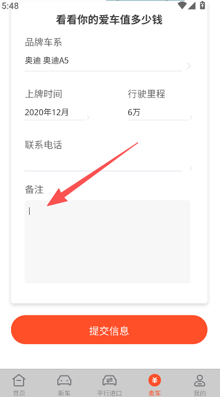 3、填写联系电话、备注,点击提交信息,完成卖车估值申请。