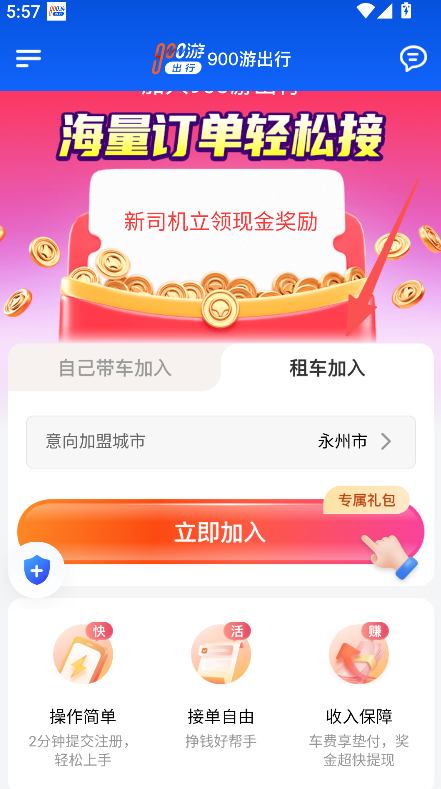 《900游出行》是一款专注司机出行服务的软件,司机可选择自己带车或租车加入,自由选择意向加盟城市,按要求上传驾驶证正面、行驶证正面等证件并提交审核,新司机立领现金奖励。接单自由,司机可灵活接单;收入保障,车费享垫付且奖金超快提现。助力司机轻松接单赚钱,为司机提供从加入到接单的全流程便捷服务,让司机在出行接单中高效获取收入,开启便捷的出行接单生涯。