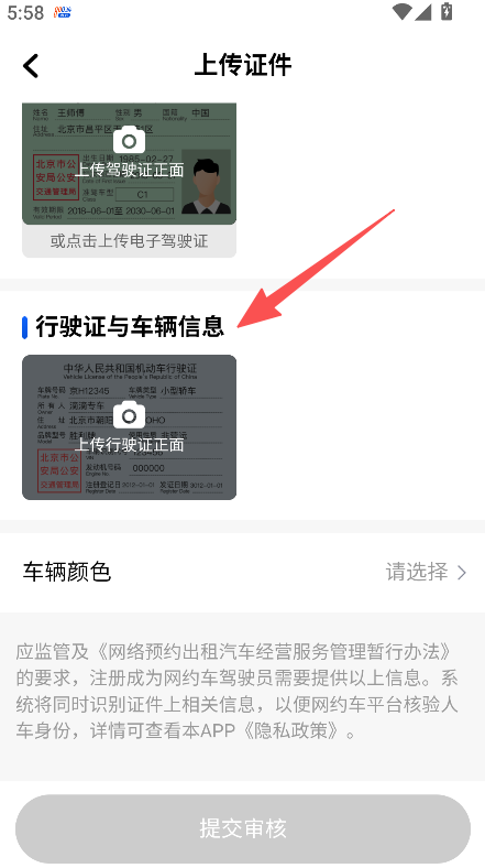 3、支持证件上传审核功能,司机需按要求上传驾驶证、行驶证等证件,提交后完成审核,进而开展接单业务。