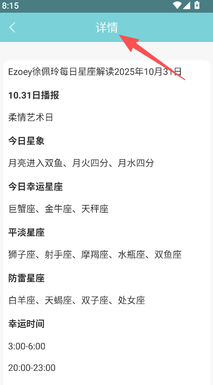 2、可查看详细星座解读详情,涵盖今日星象、幸运星座、平淡星座、防雷星座、幸运时间等内容。