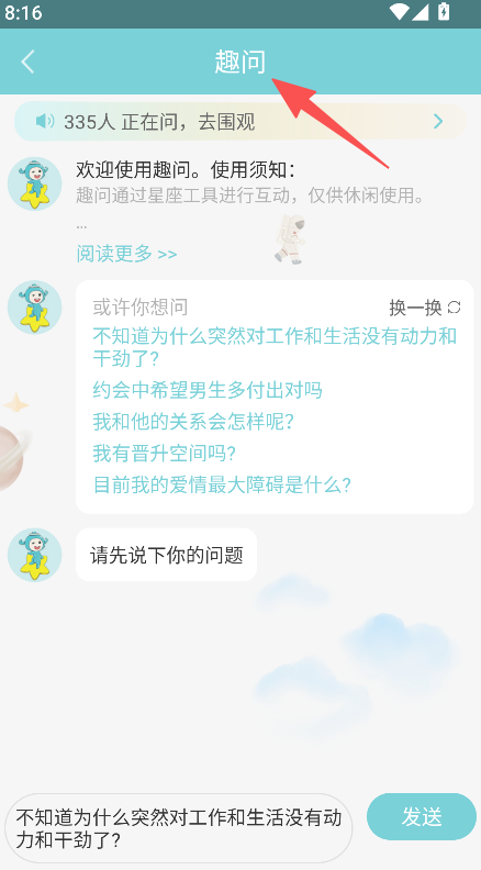3、趣问互动有趣,提供多样问题参考,用户可发送问题参与互动,增添星座探索的趣味性。