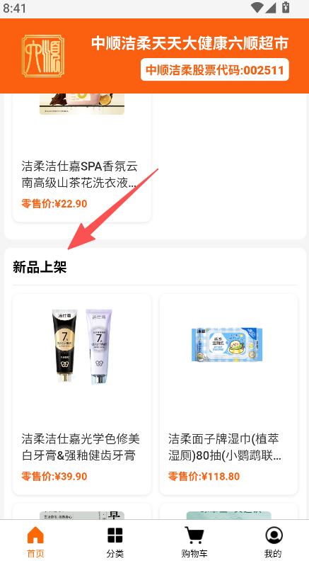 3、商品展示直观,新品上架板块突出,助力用户及时了解超市新商品,提升购物选择的丰富性。