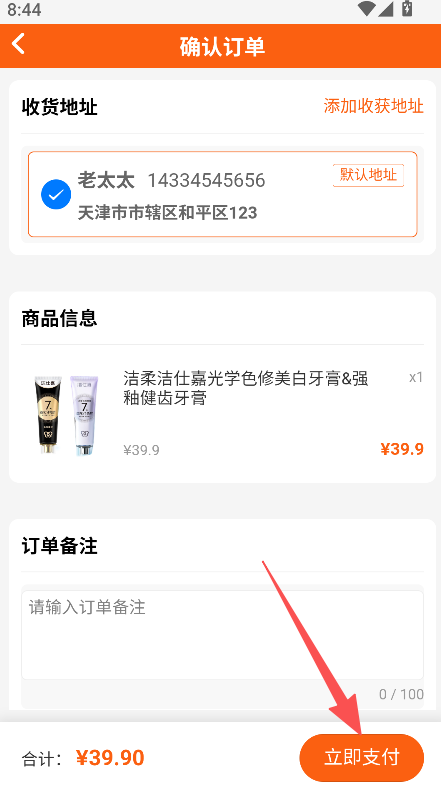 3、订单支付流程简洁,确认订单后立即支付,让用户快速完成超市商品的线上购买。