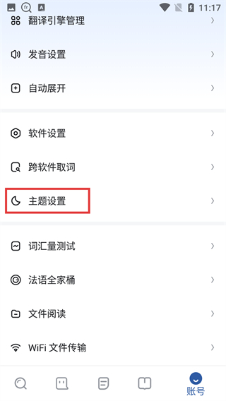 2、进入账号页面后,找到【主题设置】选项并点击。