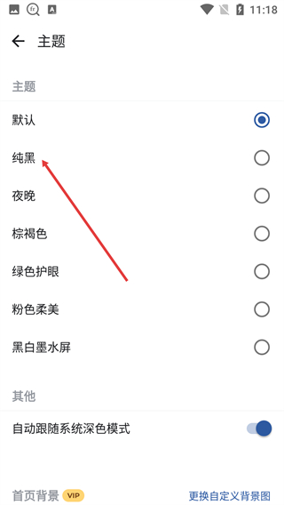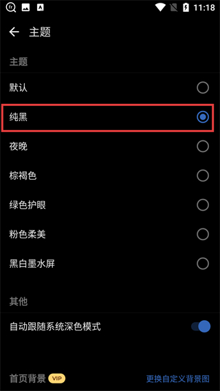 4、在【主题】设置页面选择【纯黑】选项,点击其对应的单选按钮,即可将界面主题切换为纯黑样式。