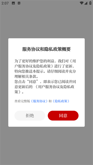 1、在钱塘发布APP启动时,点击“同意”按钮,接受服务协议和隐私政策概要,进入APP使用流程。