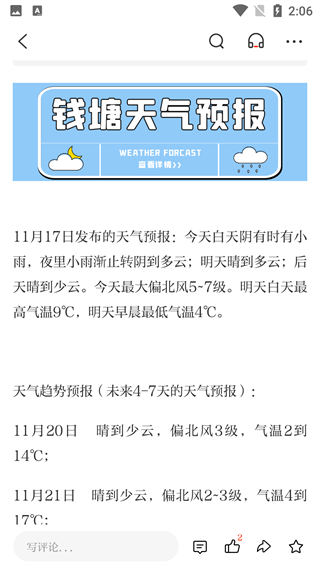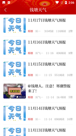 2、在APP新闻页面,点击“钱塘天气”功能选项,进入钱塘天气专区。