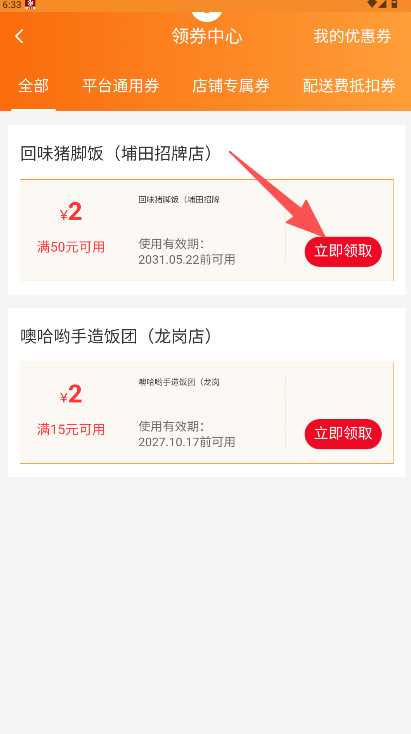 3、在领券中心浏览各类优惠券并点击立即领取获取新券。