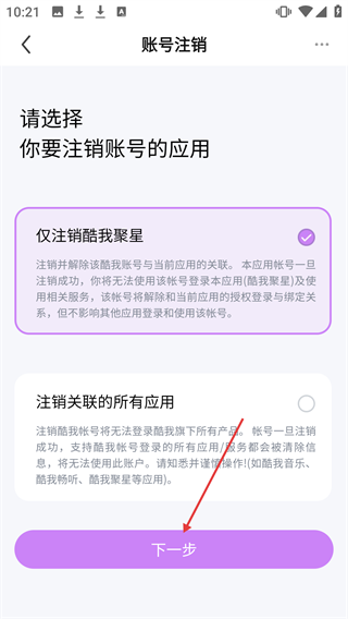 4、选择要注销账号的应用范围后,点击“下一步”按钮。