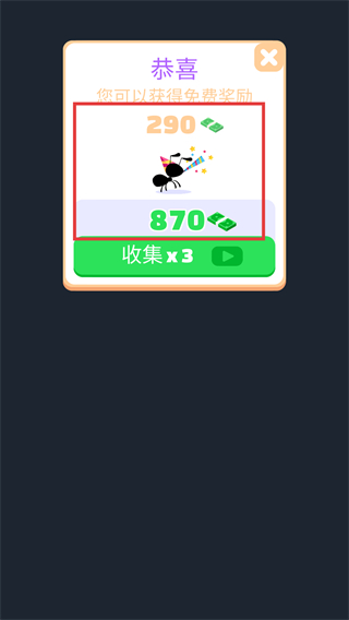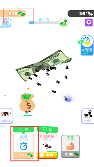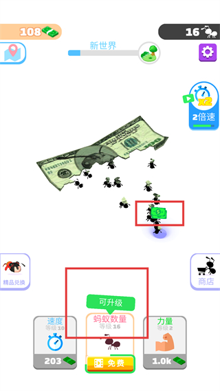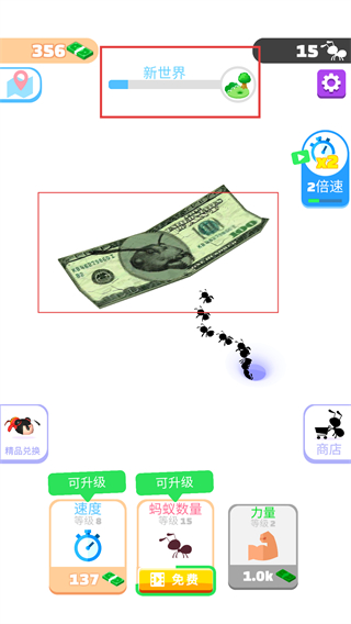 2、利用蚂蚁收集美元等资源,积累金币用于后续升级,同时注意收集带有金币的蚂蚁,快速增加资源储备。
